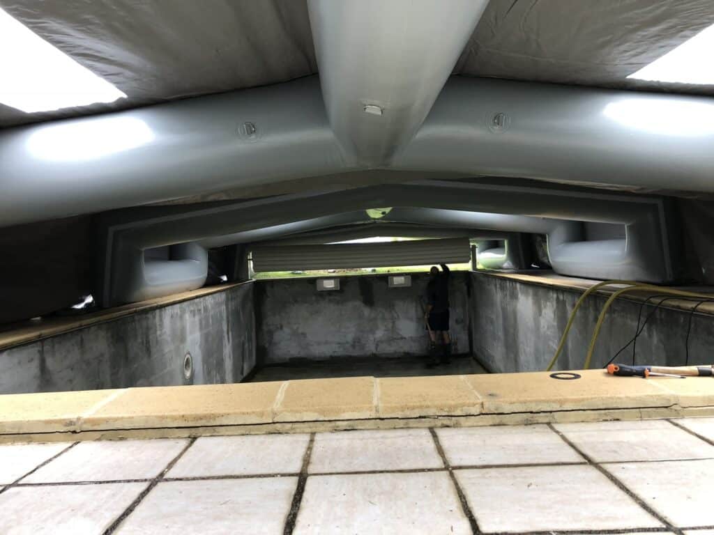 Pour plaquer le liner contre la structure, nous avons mis en œuvre une mise en dépression (aspiration d’air entre la membrane et la paroi) à l’aide d’un aspirateur industriel puissant, puis nous avons commencé le remplissage progressif. Cette méthode (appelée tension hydrique) associe dépression et pression de l’eau pour étirer uniformément le liner et réduire les plis.