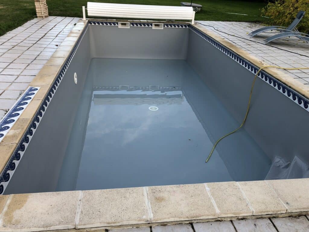 Toute aspérité a été poncée et mastiquée si nécessaire : la préparation du support reste primordiale, car un défaut se répercute toujours à travers le liner. Pour les non‑initiés : le liner forme une membrane souple qui épouse la forme du bassin ; si la surface sous‑jacente présente des irrégularités, ces défauts restent visibles.